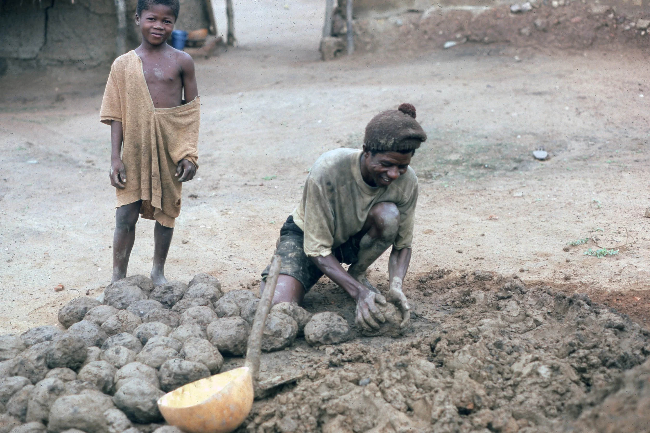 “Assisted by his son (Wayo Fordjour), a skilled builder (Akwasi Nyua Tonyaa) shapes balls of atakpame as he prepares to add another course to the walls of a house under construction. Each course must be allowed to dry gradually before the next is added in order to create a strong wall. Calabash bowls (chrԑgbͻͻ in Nafaanra) used by the builder sit nearby... Dompofie, September, 1982.” Source Dr Ann Stahl, University of Victoria Libraries